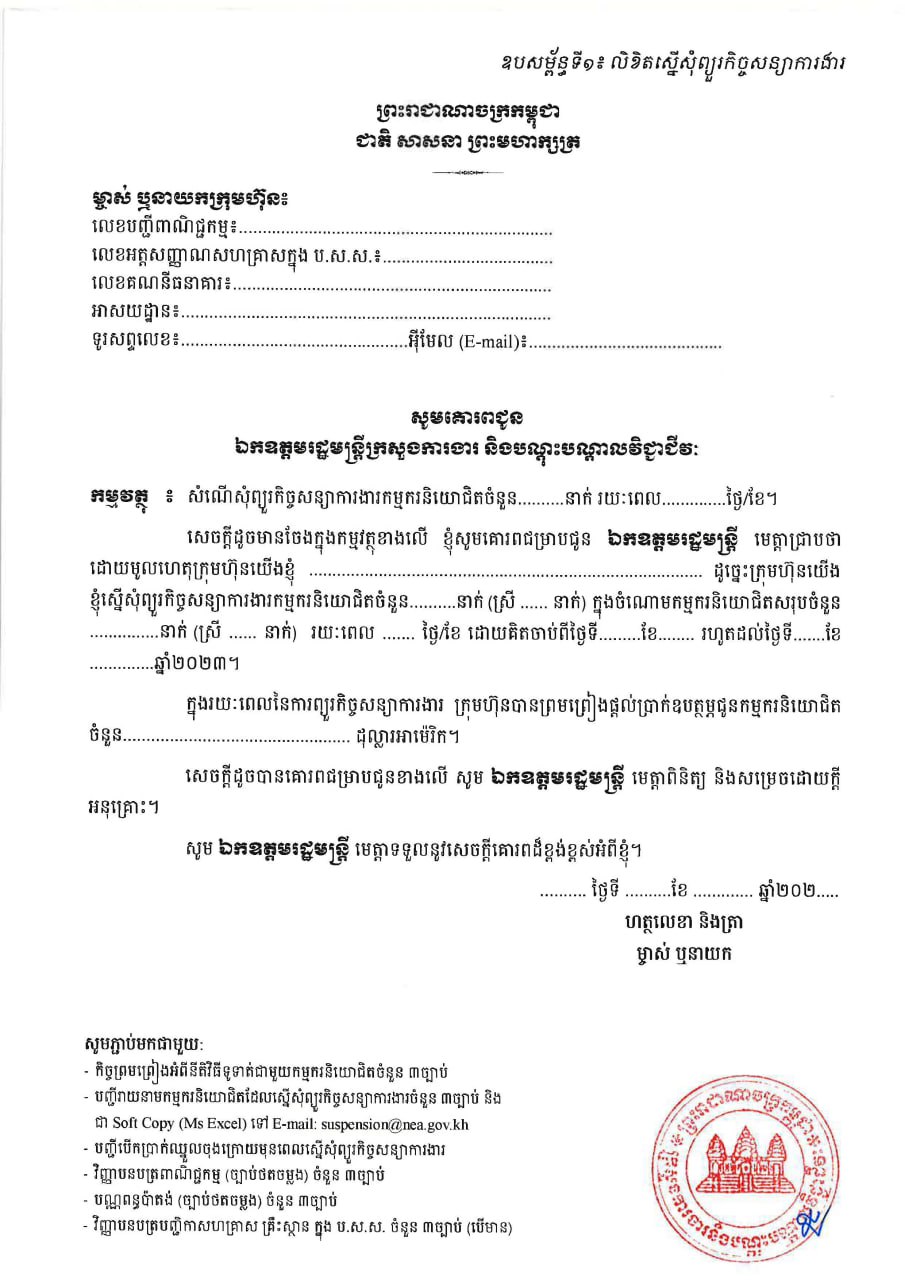 សេចក្ដីណែនាំ លេខ២០/២៣ ស្តីពីការព្យួរកិច្ចសន្យាការងារកម្មករនិយោជិតធ្វើការនៅរោងចក្រក្នុងវិស័យវាយនភណ្ឌ កាត់ដេរ ផលិតស្បែកជើង និងផលិតផលិតផលធ្វើដំណើរនិងកាបូប