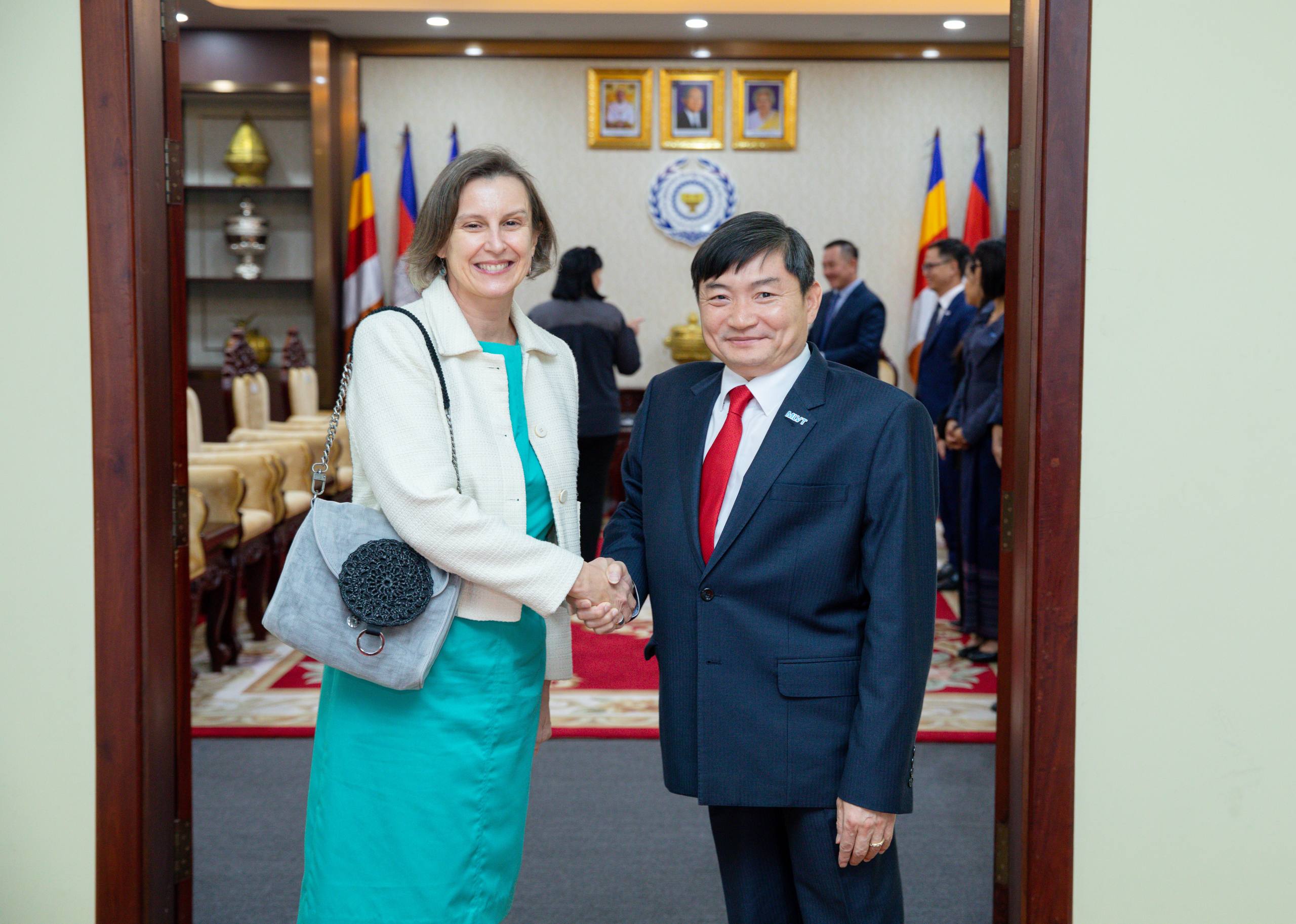 (រាជធានីភ្នំពេញ)៖ បន្ទាប់ពីបានខិតខំរួមគ្នាសម្រេចបាននូវការដាក់ឱ្យដំណើរការជាផ្លូវការនូវមជ្ឈមណ្ឌលឧត្តមភាពយានយន្តកម្ពុជា (ACE Cambodia) ជាលើកដំបូង ដែលជាផ្លែផ្កានៃកិច្ចសហប្រតិបត្តិការកម្ពុជា-អូស្ត្រាលីលើការអភិវឌ្ឍជំនាញនៅកម្ពុជាកាលពីម្សិលមិញរួចមក, នារសៀលថ្ងៃអង្គារ ទី១៧ ខែមីនា ឆ្នាំ២០២៦ នេះ ឯកឧត្តម ហេង សួរ រដ្ឋមន្ត្រីក្រសួងការងារ និងបណ្ដុះបណ្ដាលវិជ្ជាជីវៈ បានទទួលជួបសម្ដែងការគួរសម និងពិភាក្សាការងារជាមួយ លោកស្រី ប្រីជែត ខូលៀរ (Bridget Collier) ភារធារីស្ថានទូតអូស្ត្រាលីប្រចាំកម្ពុជា និង លោកស្រី សារ៉ន ប៊ូរ៉ូ (Sharan Burrow) ប្រធានក្រុមប្រឹក្សានៃវិទ្យាស្ថាន Bendigo Kangan (BKI) នៅទីស្តីការក្រសួង ដើម្បីពិភាក្សាផ្លាស់ប្តូរយោបល់ក្នុងការស្វែងរកឱកាសពង្រីកកិច្ចសហប្រតិបត្តិការថ្មីៗបន្ថែមទៀត ឆ្លើយតបទៅនឹងតម្រូវការទីផ្សារការងារ ដែលវិស័យឧស្សាហកម្មនៅកម្ពុជាកំពុងមានតម្រូវការខ្ពស់។