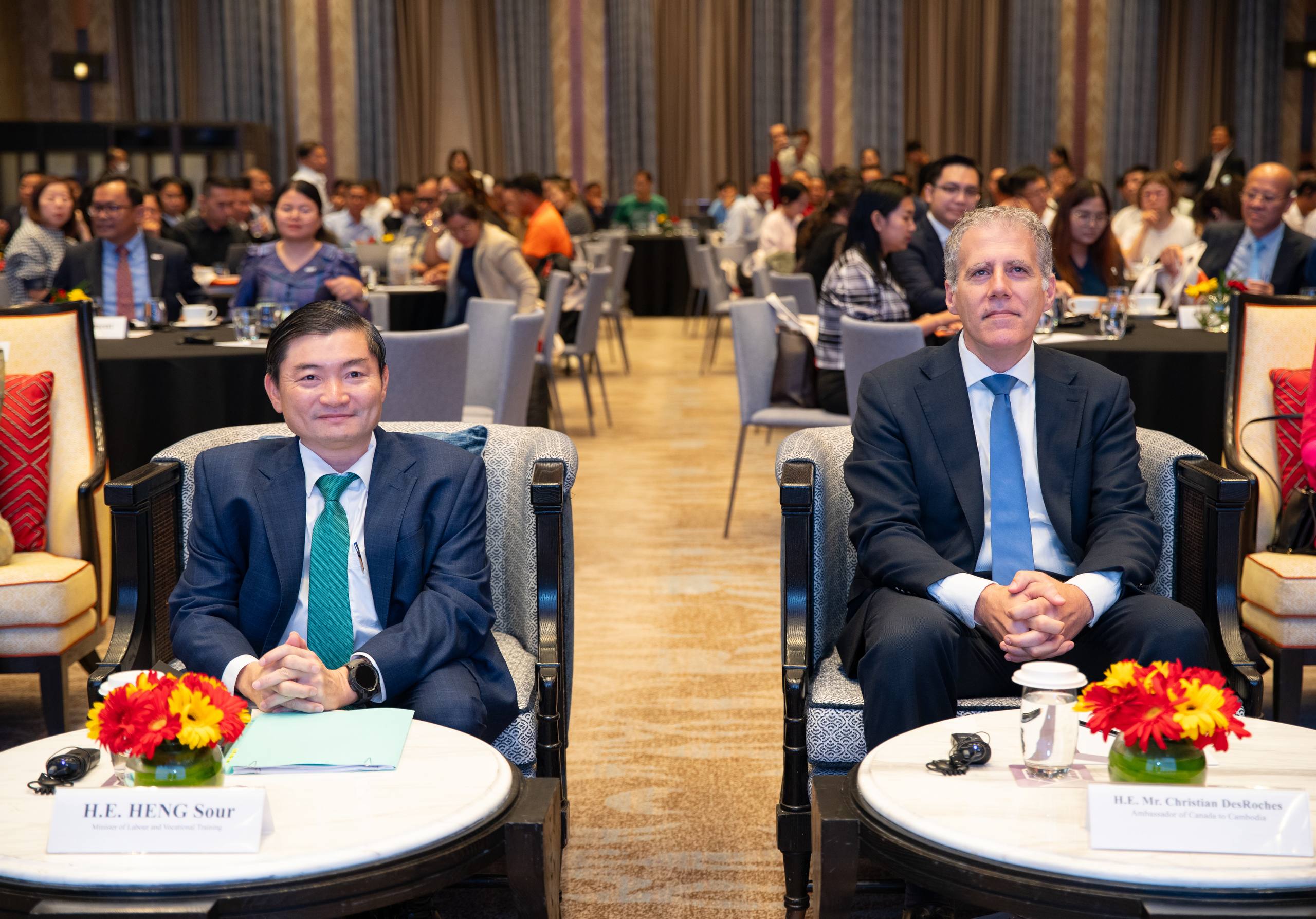 នាឱកាសនោះដែរ ឯកឧត្ដម Christian DesRoches ឯកអគ្គរដ្ឋទូតកាណាដាប្រចាំកម្ពុជា និងលោកស្រី Froukje Boele ប្រធានគម្រោង ILO-BFC បានសង្កត់ធ្ងន់ពីសារៈសំខាន់នៃទំនាក់ទំនងវិជ្ជាជីវៈ ដែលកើតចេញពីការប្តេជ្ញាចិត្តរួមរបស់រដ្ឋាភិបាល និយោជក និងសហជីព ក្នុងការពង្រឹងវិស័យផលិតកម្ម និងលើកកម្ពស់សិទ្ធិកម្មករនិយោជិត តាមរយៈសន្ទនាសង្គម និងកិច្ចសហប្រតិបត្តិការ។ ពួកគាត់ប្តេជ្ញាគាំទ្រក្នុងការអភិវឌ្ឍប្រព័ន្ធទំនាក់ទំនងវិជ្ជាជីវៈដ៏រឹងមាំ ដែលជួយបង្កើនផលិតភាព និងស្ថិរភាពការងារ ព្រោះថាការចូលរួមរបស់ភាគីទាំងអស់ និងការប្រើប្រាស់បច្ចេកវិទ្យាថ្មី នឹងជួយបន្តលើកកម្ពស់វិស័យនេះឱ្យមានចីរភាព។